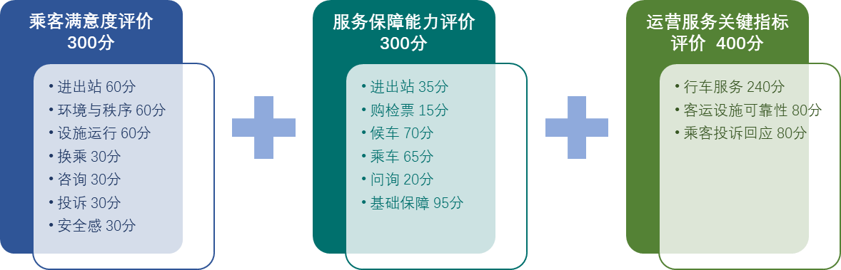 评价内容包含乘客满意度评价、服务保障能力评价及运营服务关键指标评价3个部分,基准分值1000分。