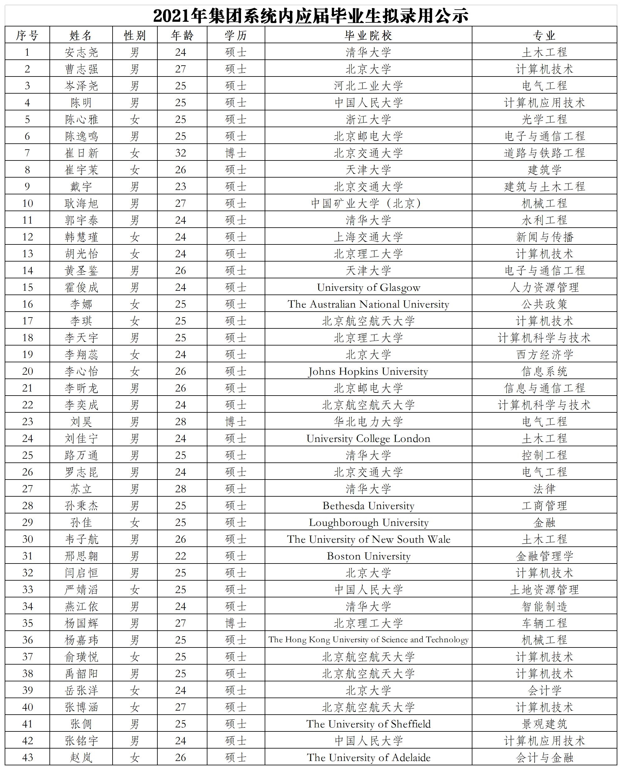 为进一步加强高校毕业生招聘工作的信息公开、过程公开和结果公开,自觉接受社会监督,根据《人力资源和社会保障部关于国有企业招聘应届高校毕业生信息公开的意见》(人社部发〔2014〕79号)、《关于印发<北京市引进非北京生源毕业生工作暂行办法>的通知》(京人社毕发〔2018〕37号)等文件有关要求,经过笔试、面试等程序,初步确定录用安志尧等43名应届毕业生,现将2021年拟录用应届毕业生情况予以公示,公示期为7天(2021年7月9日—7月15日)。拟录用应届毕业生名单详见附件(按姓氏字母排列顺序)。北京市引进非北京生源毕业生工作暂行办法>