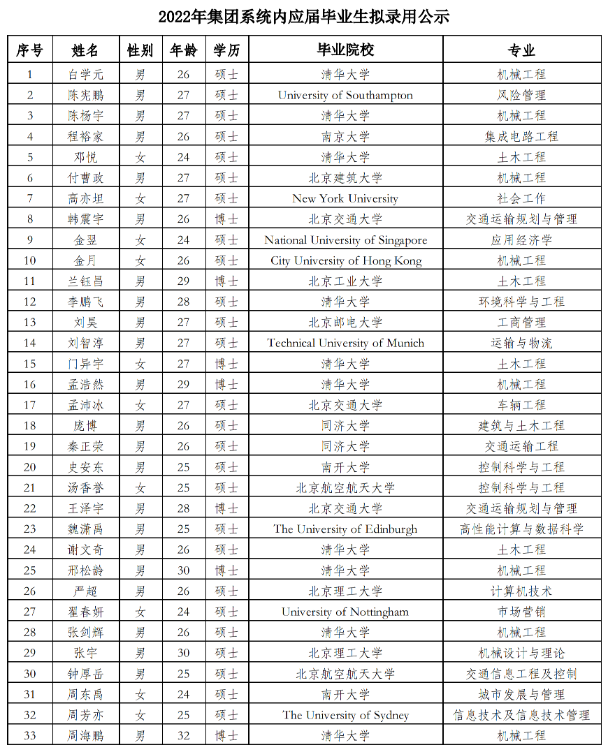 为进一步加强高校毕业生招聘工作的信息公开、过程公开和结果公开,自觉接受社会监督,根据《人力资源和社会保障部关于国有企业招聘应届高校毕业生信息公开的意见》(人社部发〔2014〕79号)、《关于印发<北京市引进非北京生源毕业生工作暂行办法>的通知》(京人社毕发〔2018〕37号)等文件有关要求,经过笔试、面试等程序,初步确定录用白学元等33名应届毕业生,现将2022年拟录用应届毕业生情况予以公示,公示期为7天(2022年7月15日—7月21日)。拟录用应届毕业生名单如下(按姓名首字母排序):